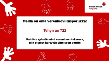 LUOVUTA JO! Ammattiosastollamme on nyt oma VeriRyhmä! Haastamme kaikki luovuttamaan (jotka vain pystyvät)! Mainitse luovutustilaisuudessa VeriRyhmän nimi "Tehyn ao 722", jolloin luovutus rekisteröityy ammattiosaston ryhmään. Käy täyttämässä terveyskysely ja tarkista sovitko luovuttajaksi. Voitte esimerkiksi työporukalla varata kimppa-ajat luovutukseen liikkuvaan veripalveluun. Haaste on heitetty, otatko vastaan? |
